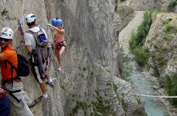 Equipés d'un casque, d'un baudrier et de longes et accompagnés par l'un de nos moniteurs, vous partirez pour une randonnée aérienne de plusieures heures.Vires, escalade de barreaux d’échelle sertis dans la roche, ponts de singe, le plaisir de découvrir les grandes parois à votre mesure dans un éspace grandeur nature. Avec vue sur gorges, villages de montagne, rivières, château fort, vous évoluerez sur les balcons de la nature...